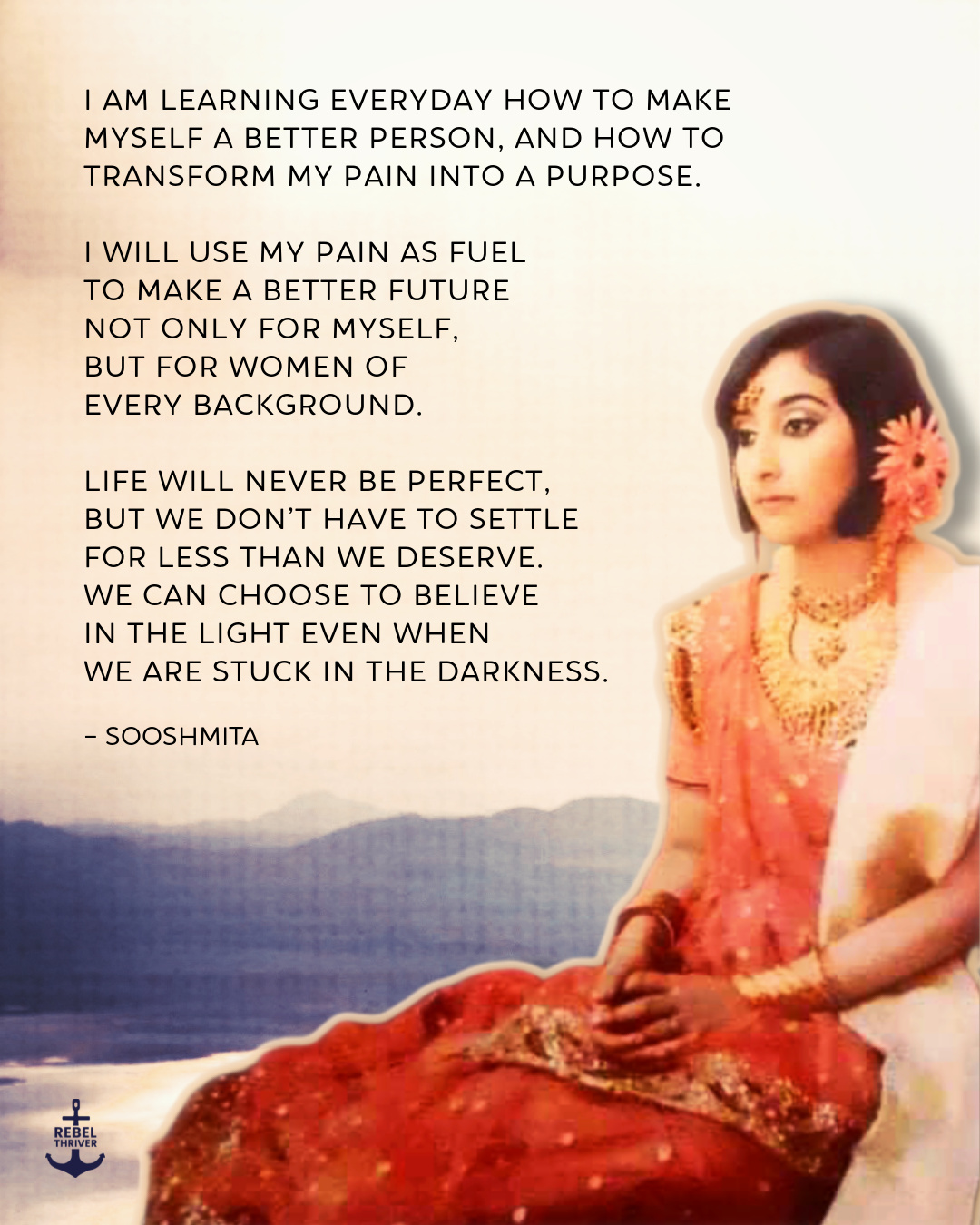 My name is Sooshmita and I am a survivor. Before I share the story of my arranged marriage, I would like to begin with my childhood, and how I used to be as a young woman. I was born in Birmingham, UK and brought up in London. I remember being very quiet, reserved, and I hardly used to speak. When I was five or six my teachers were worried that I may have speech difficulties and suggested to my mum to take me to a speech therapist. After a number of sessions at the hospital they concluded that was able to speak, but just very shy and quiet. As a child I can remember not being able to express my needs, and I suppressed my emotions so that I could fit in with others. As a result, I had many negative experiences in both primary and high school